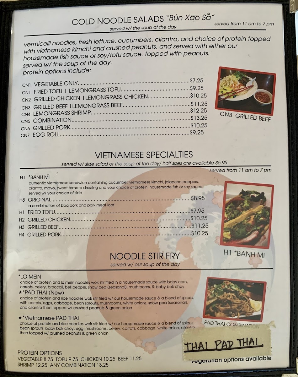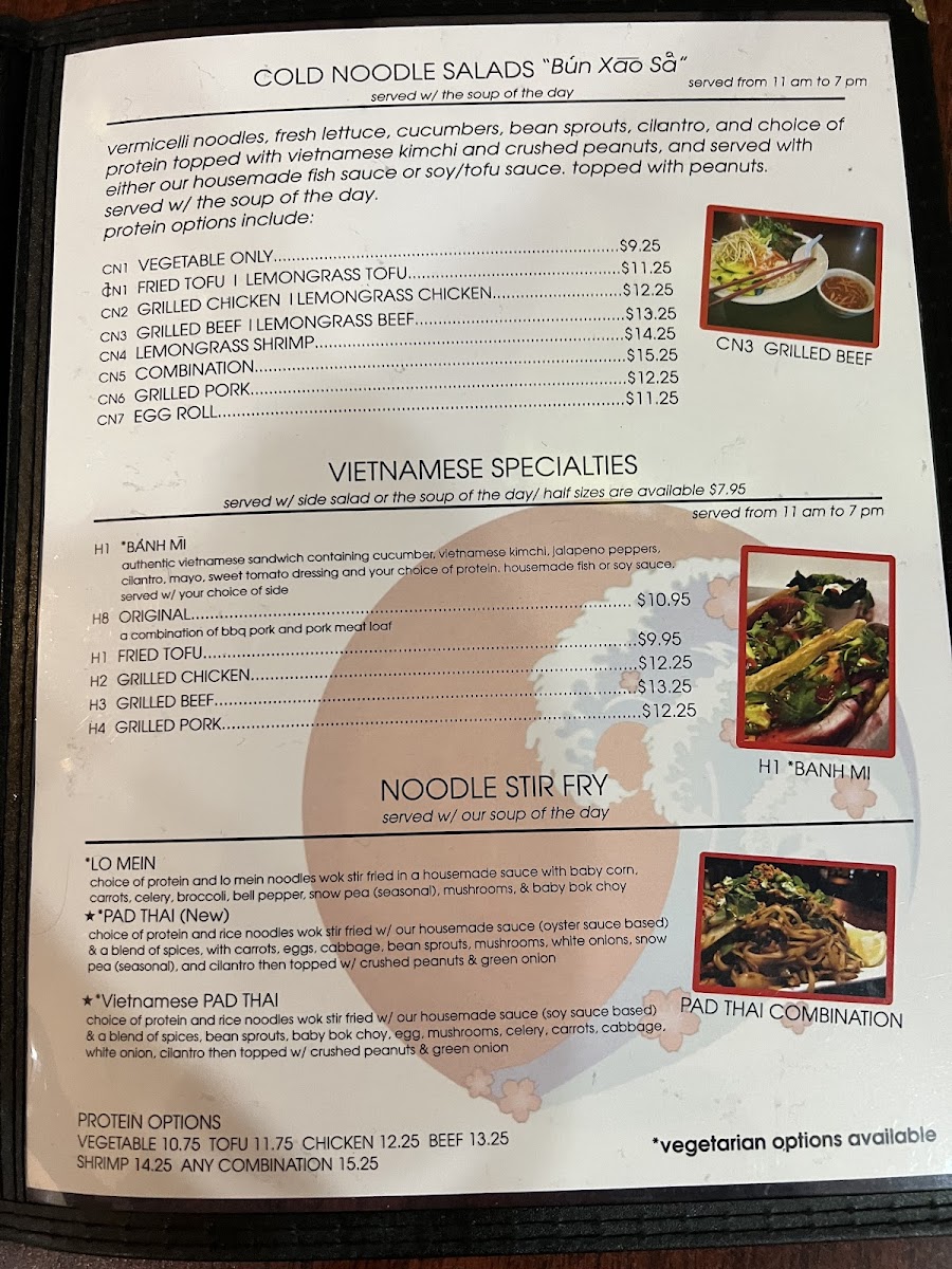 Vermicelli noodles, fresh lettuce, cucumbers, bean sprouts, cilantro, and choice of protein, topped with Vietnamese kimchi and crushed peanuts. Served with house-made fish sauce or soy/tofu sauce, and topped with peanuts.