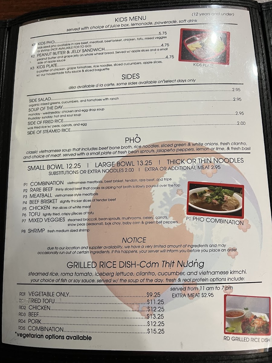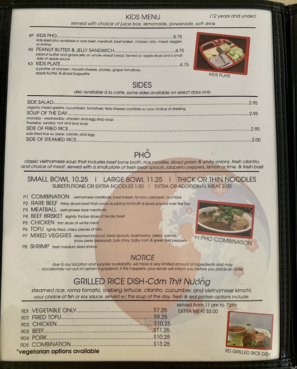Kid-sized pho available in rare beef, meatball, beef brisket, chicken, tofu, mixed veggies, or shrimp (NOT AVAILABLE FOR TO-GO) (Choice of rice noodles or egg noodles)