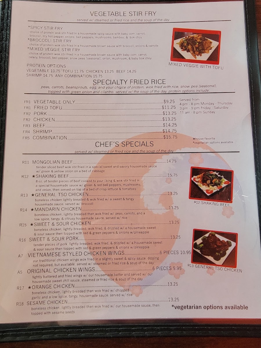 Monday - Wednesday: Chicken and egg drop soup Thursday - Sunday: Hot and sour soup